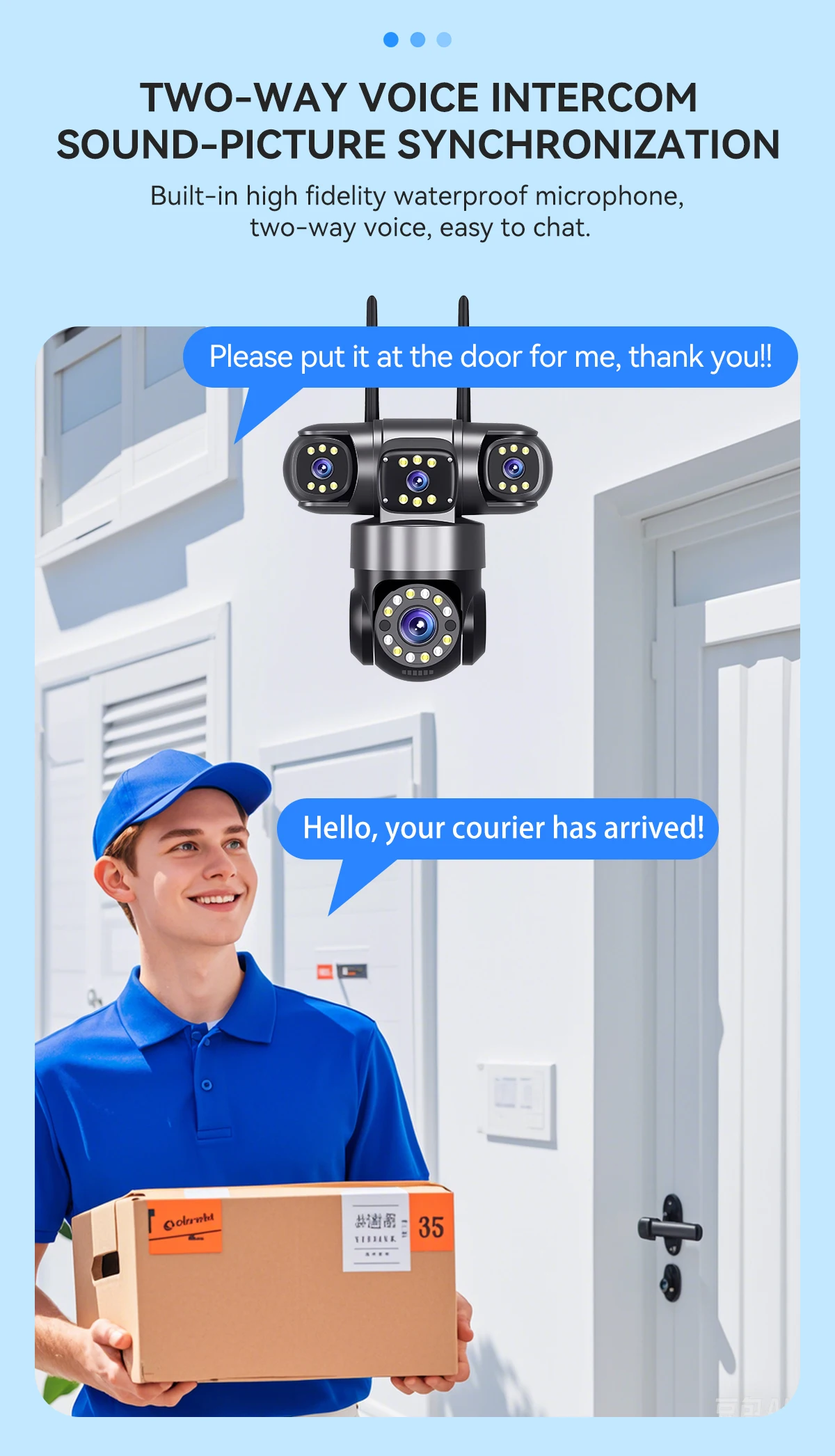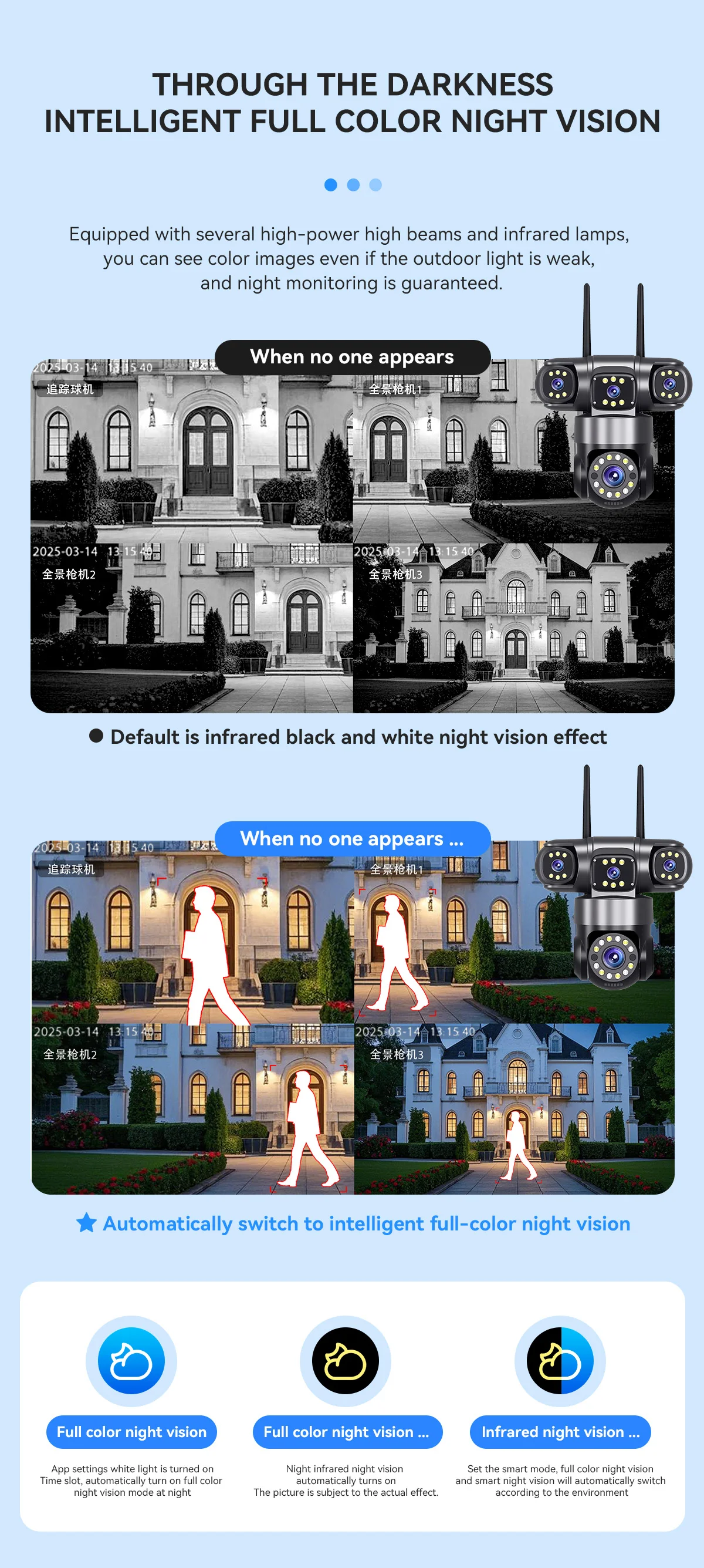 Whether you’re safeguarding a storefront, monitoring a loading dock, or keeping an eye on your front door, this camera adapts to your needs. Use the app for remote control, live viewing, and rapid response to events. The four‑lens, four‑screen design gives you a practical, scalable solution that evolves with your security requirements.